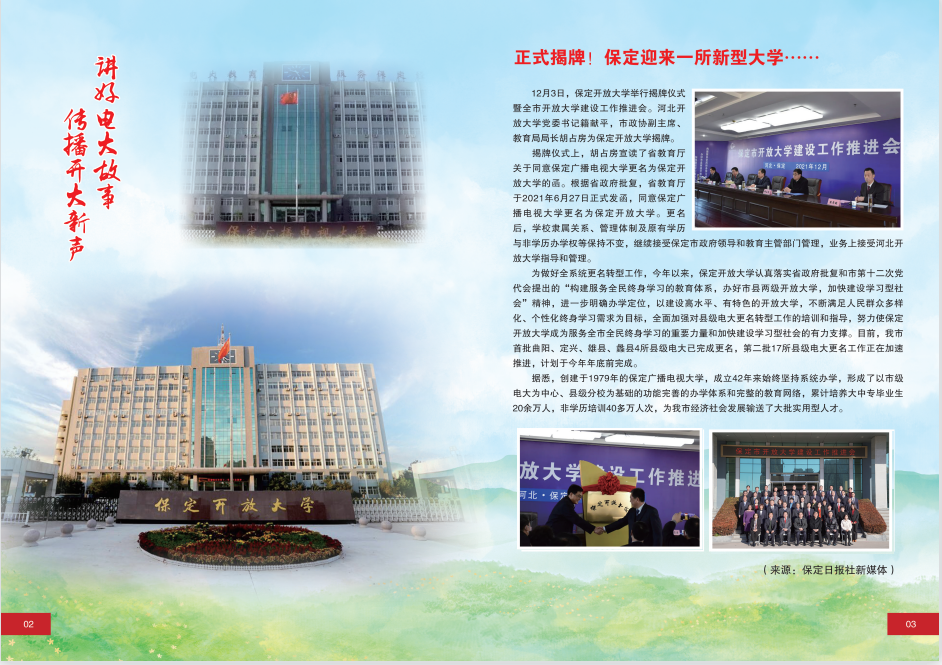 文集的面世是對保定開放大學更名的紀念,更是對學校滿懷理想、開拓創新的美好愿景,在新的歷史起點上,保定開放大學將以更加執著的信念,勇擔時代使命,為建設“人人皆學、處處能學、時時可學”的學習型社會做出新的更大貢獻。