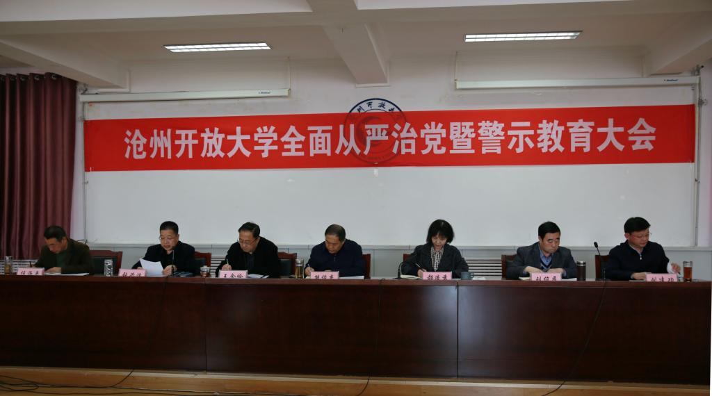 2月20日,滄州開放大學召開由全體教職員工參加的全面從嚴治黨暨警示教育大會。這次大會是本學期召開的第一次大會,主題就是表明學校黨委馳而不息推進全面從嚴治黨向縱深發展的堅定決心,強調作風紀律在全校發展中的極端重要性。校黨委書記熊俊杰發表講話,黨委委員劉俊民、張興波、劉建功分別部署工作,兩個科室負責人作表態發言,滄州市委巡察組徐在勇主任與會指導,黨委副書記、校長郝清秀主持大會。